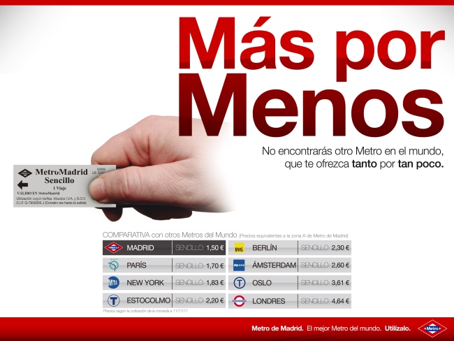 He llegado al curro cabreado a más no poder. Y todo por esta publicidad de Metro de Madrid en la que se referencia el precio del billete sencillo en varias ciudades del mundo para concluir que el de Madrid, pese al “tarifazo” de hace unos meses que encareció el billete un 50%, es el más barato.