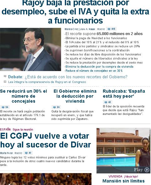 En primer plano, los recortes anunciados por Mariano Rajoy, cuya consecuencia previsible es un mayor empobrecimiento de las clases populares españolas. Y en segundo plano, abajo a la derecha, una mansión de lujo de esas que con tanto regocijo nos muestran ahora todos los medios, para que veamos que en España seguimos viviendo bien. Al menos, algunos.